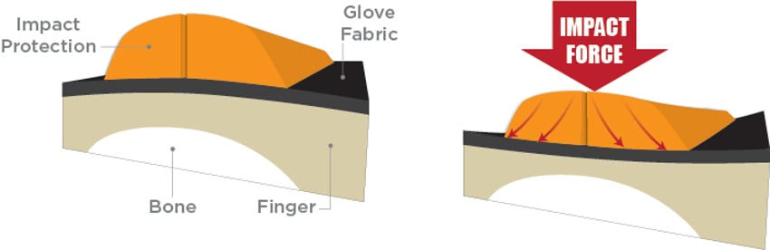 Back of hand and finger protection is an added feature to gloves that helps disperse the force of impact, helping to prevent or reduce injury. Rubber or other material is strategically placed over vulnerable points such as the knuckles, back of the hand and fingers. These impact protection pads are there to absorb and disperse force and protect the hand.