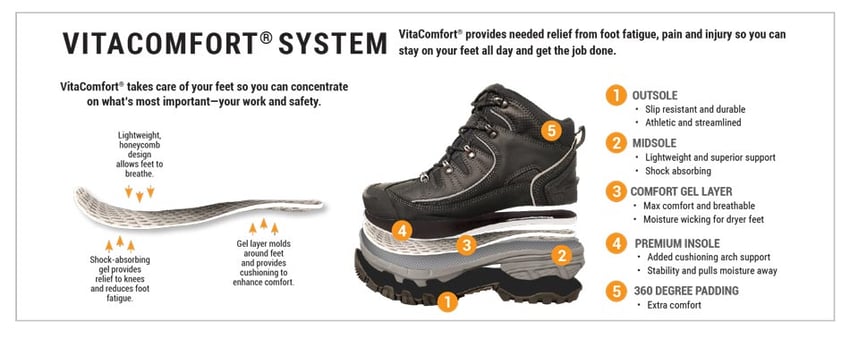 The VitaComfort® layer provides comfort and shock absorption that helps curtail foot, knee and back pain. Paired with a gravity-fed moisture management system that wicks away perspiration and allows feet to breathe, the VitaComfort® system helps you forget about your feet so you can focus on what really matters – the job.